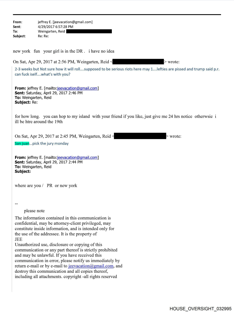- Epstein and his lawyer discussing the 2017 protests and taking a trip to the Dominican Republic