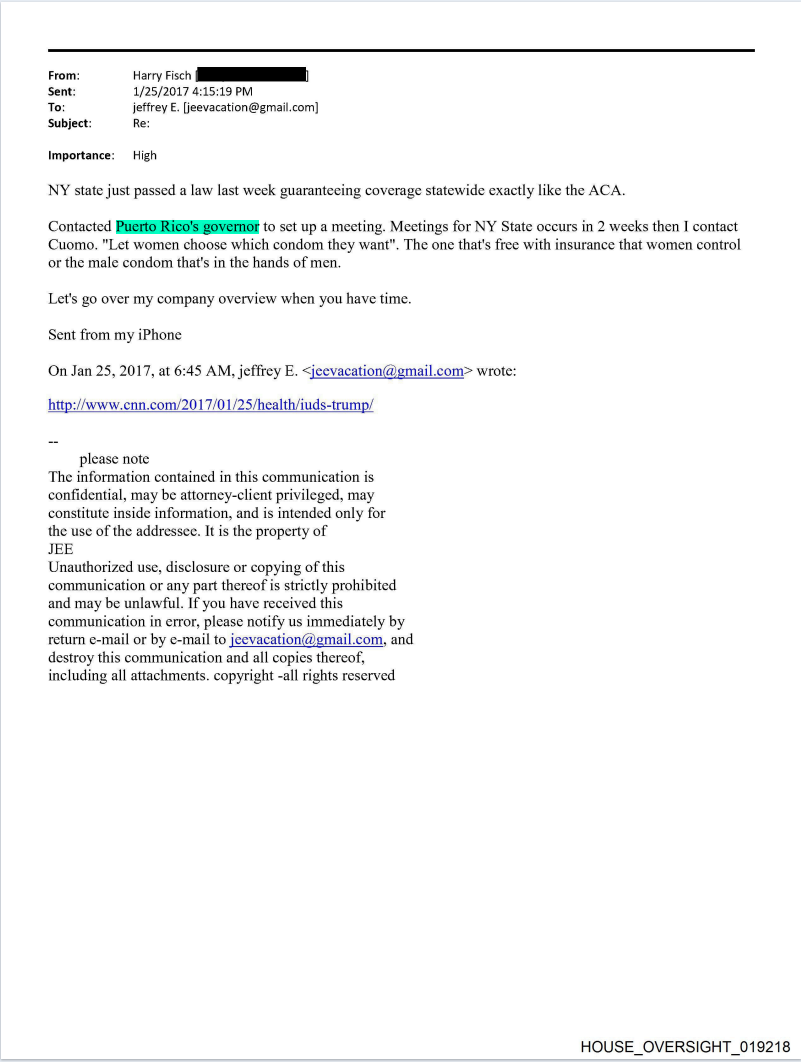 Someone named Harry Fisch emailed Epstein saying that he had "contacted Puerto Rico's governor to set up a meeting. Meetings for NY State occurs in 2 weeks then I contact Cuomo." The importance on the email was set to "High." This email was first reported by investigative reporter Daniel Boguslaw.