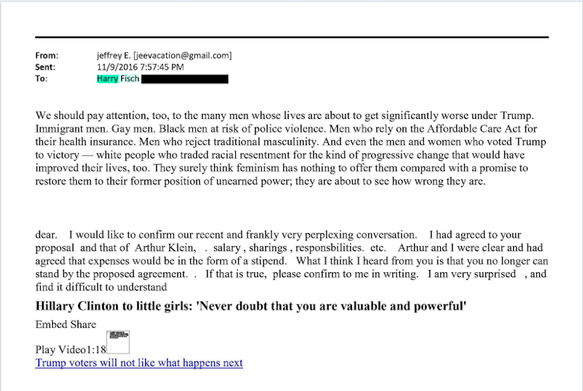A couple of months earlier, in November 2016, Epstein had emailed Fisch a quote from a Washington Post article about what Trump's presidency means for feminists, and Epstein being mad that Fisch did not honour some agreement they had previously had.