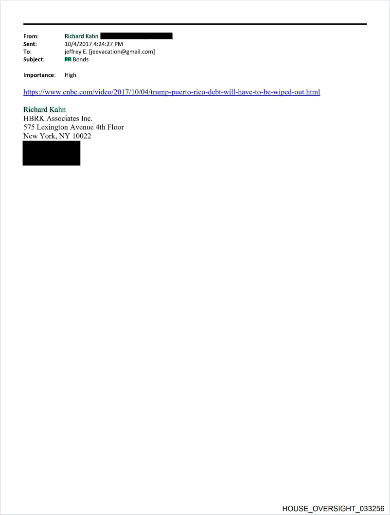Richard Kahn, Epstein's former accountant, sent him an email in October 2017 with the subject line "PR Bonds." The only thing in the body of the email is a link to a CNBC article about Puerto Rico's debt crisis and how Trump said it had to be wiped out. At time of writing, the video file on CNBC is inaccessible.