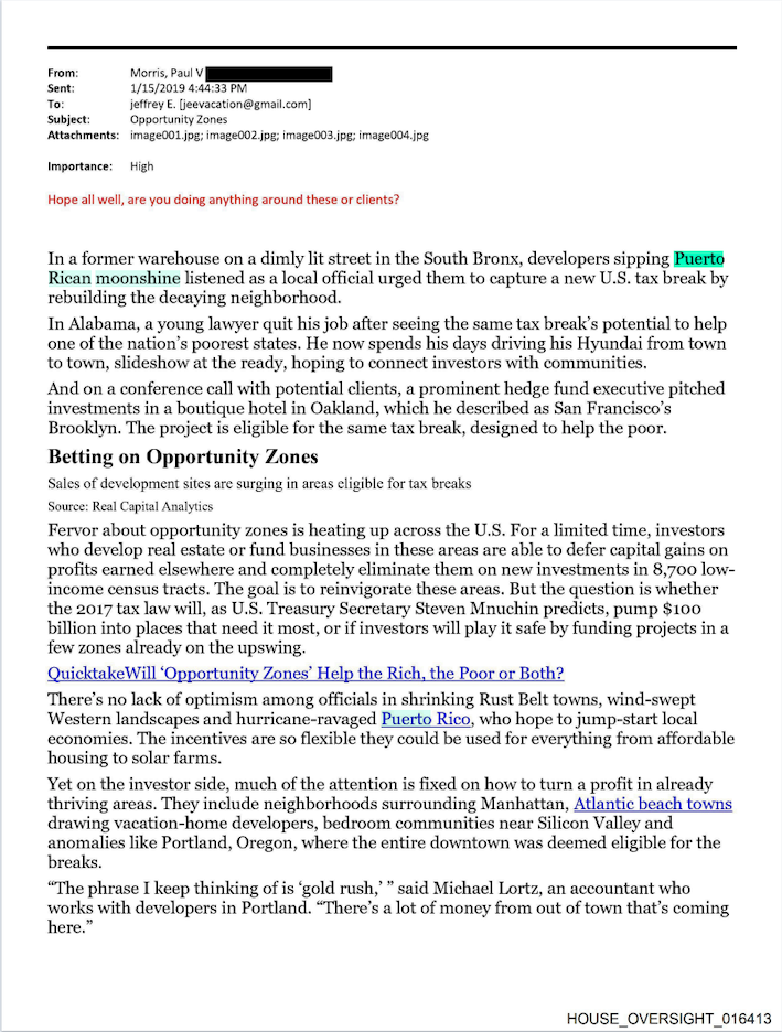 In January 2019, someone named Paul V. Morris sent Epstein an email whose title is "Opportunity Zones." The body of the email is mostly a copy/paste of an entire Bloomberg article about opportunity zones across the United States. Before that, Morris wrote "Hope all well, are you doing anything around these or clients?"