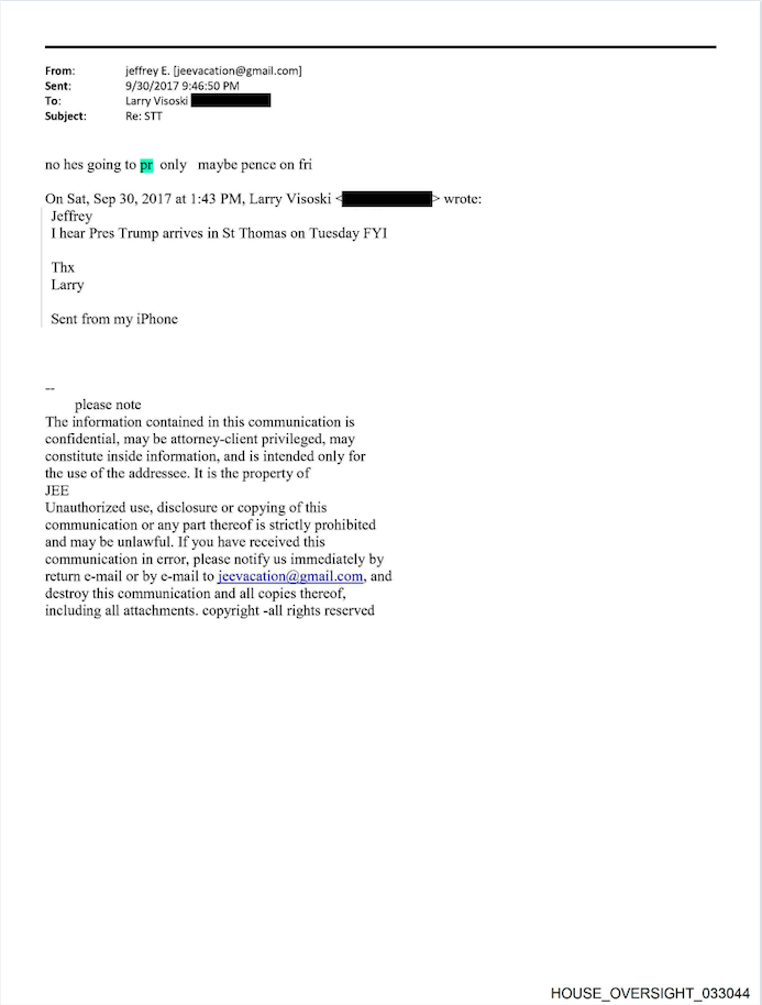 Finally, just because I don't know where else to put it, here's an email exchange between Epstein and Larry Visoski, his former pilot, from September 30, 2017, where the latter was letting Epstein know about Trump possibly visiting the U.S. Virgin Islands. However, Epstein corrected him to say that Trump was only visiting Puerto Rico and that Mike Pence would visit the U.S. Virgin Islands on Friday.