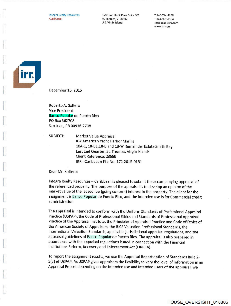 The last thing I think is worth highlighting is an appraisal document sent to Roberto A. Soltero, Vice President of Banco Popular de Puerto Rico, in December 2015 by Integra Realty Resources – Caribbean. The company appraised the American Yacht Harbor Marina in St. Thomas, which was half-owned by Epstein, according to The Virgin Islands Daily News.