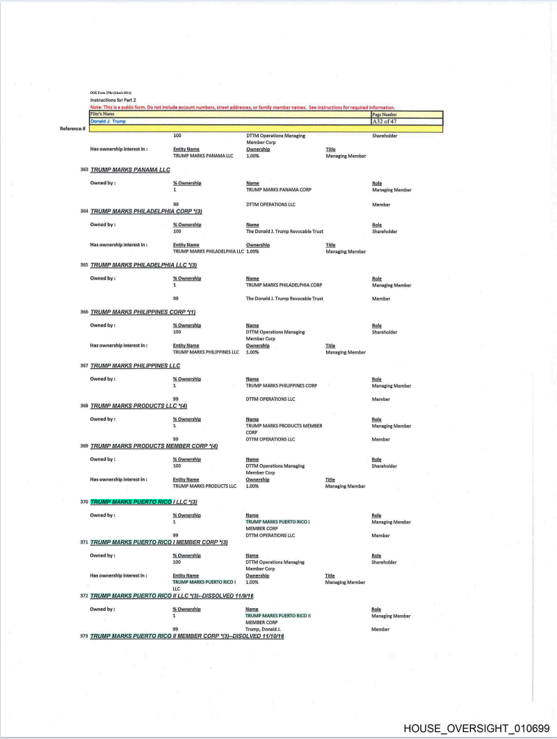 The document also shows there was a Trump Marks Puerto Rico II LLC and Member Corp that were dissolved in 2016.