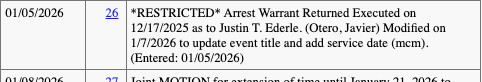 A previous version of this section read that an arrest warrant was issued on January 5, which reflected what PACER showed at the time. However, PACER has since updated to show that the warrant was returned executed on December 17, 2025 and that the docket had been updated to reflect that. This section has been updated to reflect what PACER says.